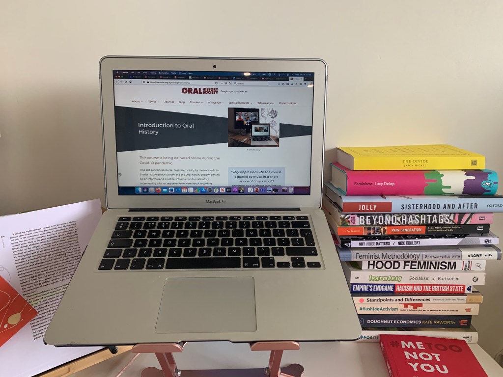My PhD is concerned with what might be understood as the 4th wave of feminism defined by the digital spaces, and my work is focused on highly visible, or viral, campaigns and events of the last decade, and their legacies. My research questions warranted a qualitative approach, since part of what I am trying to understand are the experiences of people at the centre of these events, during and once the news cycle has moved on, and to take a snapshot of these particular moments in time and the conditions that gave rise to them. With these considerations in mind, it became apparent that an oral history approach could fit well with this project. Traditionally, and among other things, oral histories can provide different insights and evidence from a new direction, they can also give a sense of belonging to a place or time, as well as challenging myths about groups of people or social phenomena. My first stop when writing my ethics application was the Oral History Society. The website has a wealth of advice and content available, from best practice to project design, and much more. I drew heavily on their documentation and standards to put together my proposal, which was eventually signed off by my University in March.