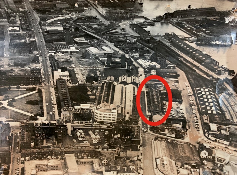 One example of an unexpected encounter that I had (just) outside of the archives was across the road in the car park. Upon paying my car parking fee, I regularly paused for a chat with the car park attendant about what I had been looking at in the archive. One of the children’s homes that I was researching was part of a row of terraces that had been demolished in what was now the very car park that we were standing in. The next day as I headed to the archive and collected my car parking ticket, he produced the aerial photograph (below, with Children’s Homes on the Bridge Street terrace circled), which was the first one I had seen of the houses and told me that his father had spent a few years growing up there.