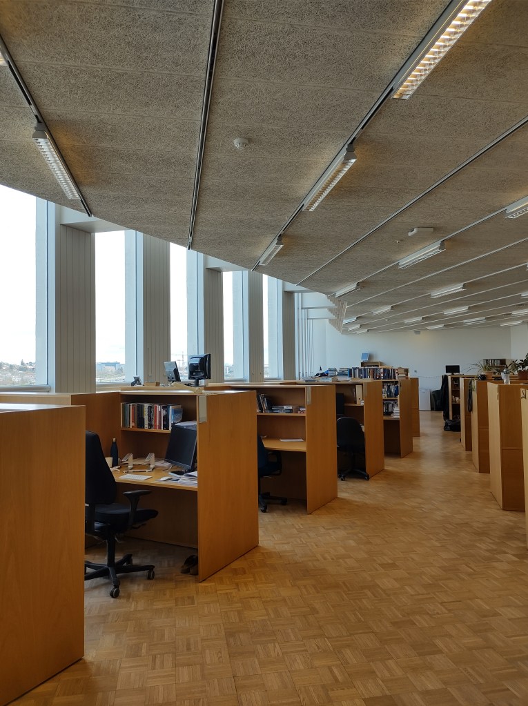 Prior to my visit I was able to establish contact with one of the professors at HÍ, Professor Eva Heiða Önnudóttir and upon arrival with the help of the admin leads Kolbrún and Sigrún (the essential people to know at university) – through communicating with each of these I was provided with an access card and a desk in the, wonderfully naturally lit, PhD office. Before getting into the more specific positives of the OIV it is worth trying to describe the University of Iceland. Most of the important buildings are connected by a tunnel system to make movement across the campus easier, safer, and drier, in the much more inclement winter months. Having been fortunate enough to arrive in spring I was treated to how bright and inviting the university is inside in the lighter months despite the rather brutal appearance most of it holds from the outside.